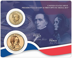 The two coin set contains an uncirculated Franklin Pierce Presidential $1 coin and a 1-5/16 inch bronze medal identical to the Jane Pierce First Spouse Gold Coin. The coins are packaged within a plastic card that has a portrait of the fourteenth President and First Lady with information on the back.